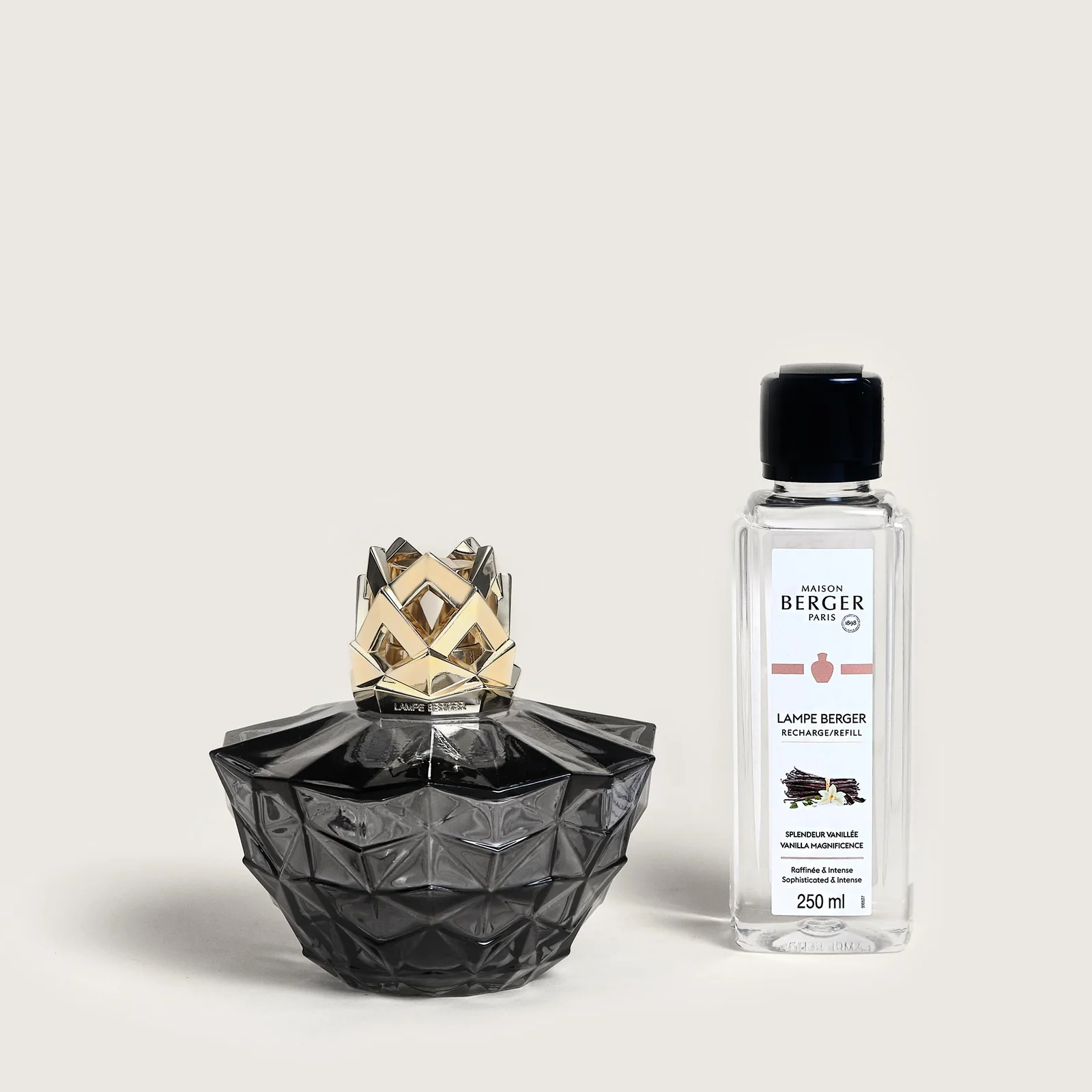 Le superfici scure della lampada Berger sono lavorate in rilievi e volumi scolpiti per catturare la luce. Questa lampada catalitica, ricaricabile con la ricarica di profumo da 250 ml in dotazione, purifica e profuma i tuoi interni, donando un tocco di eleganza al tuo spazio abitativo.