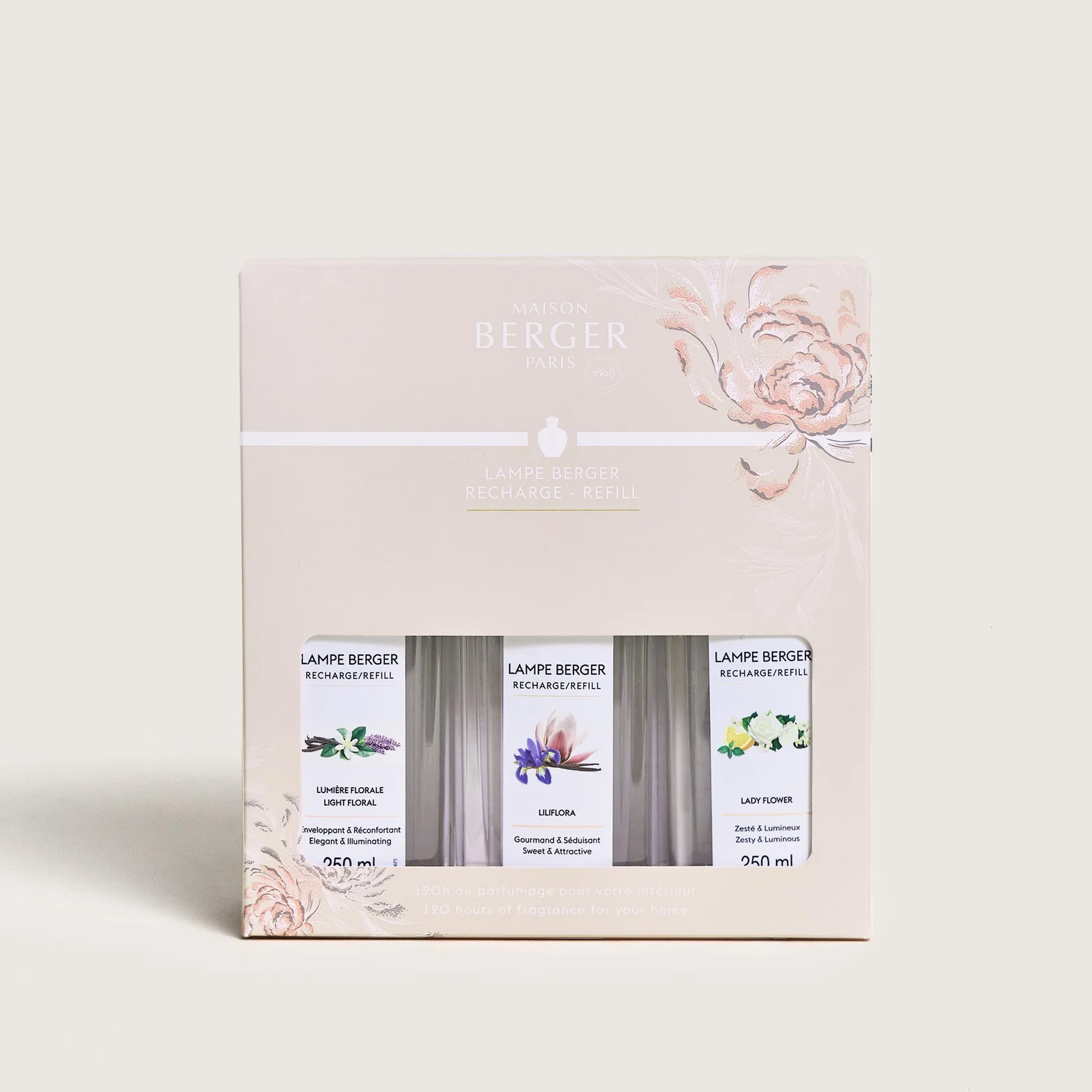 Questo set di tre ricariche Lampe Berger da 250 ml offre un'esperienza olfattiva variegata grazie a tre fragranze iconiche.