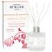 Un flacone in vetro smerigliato decorato con fiori trasparenti ed un anello di metallo argentato. 6 bastoncini chiari in salice naturale che diffondono il profumo.