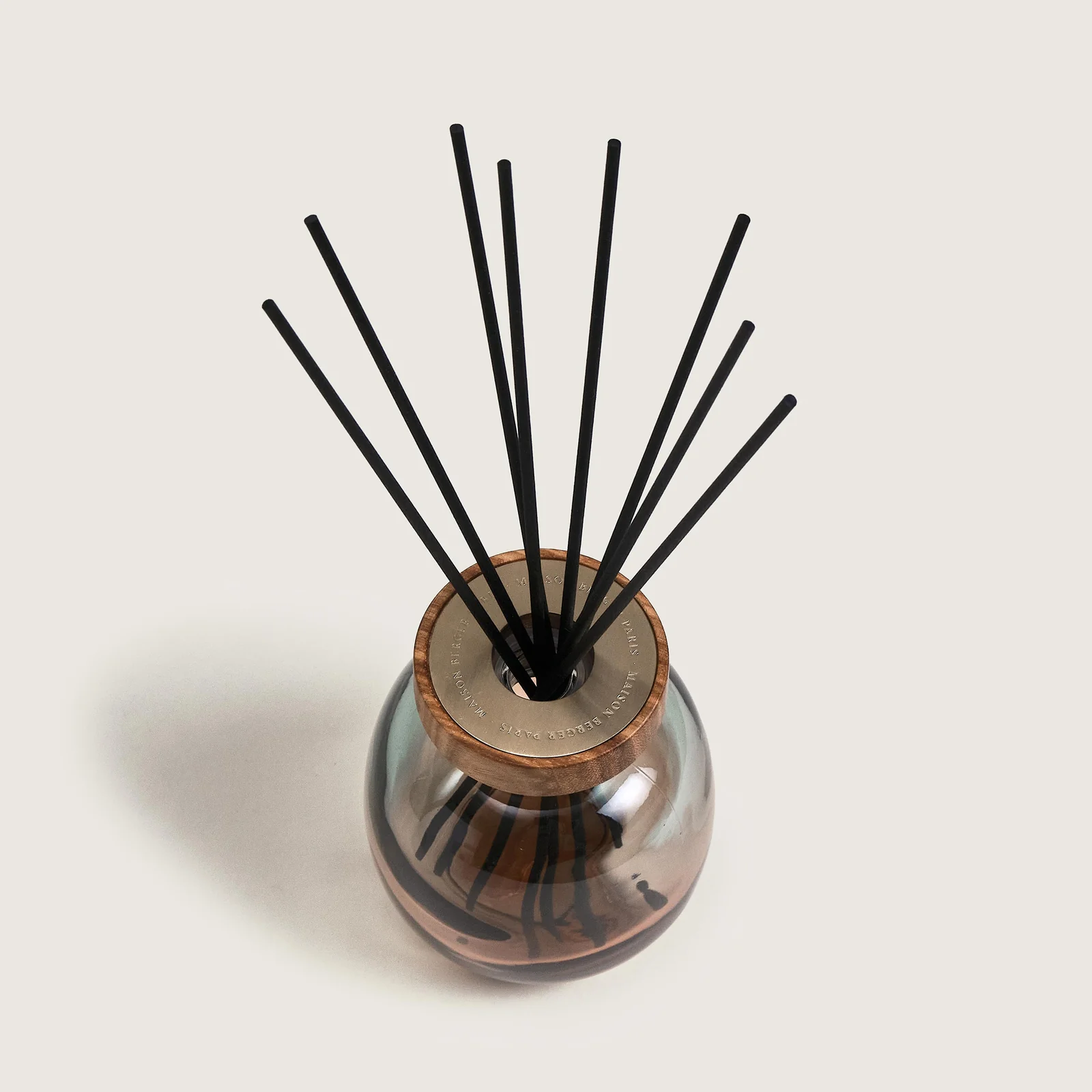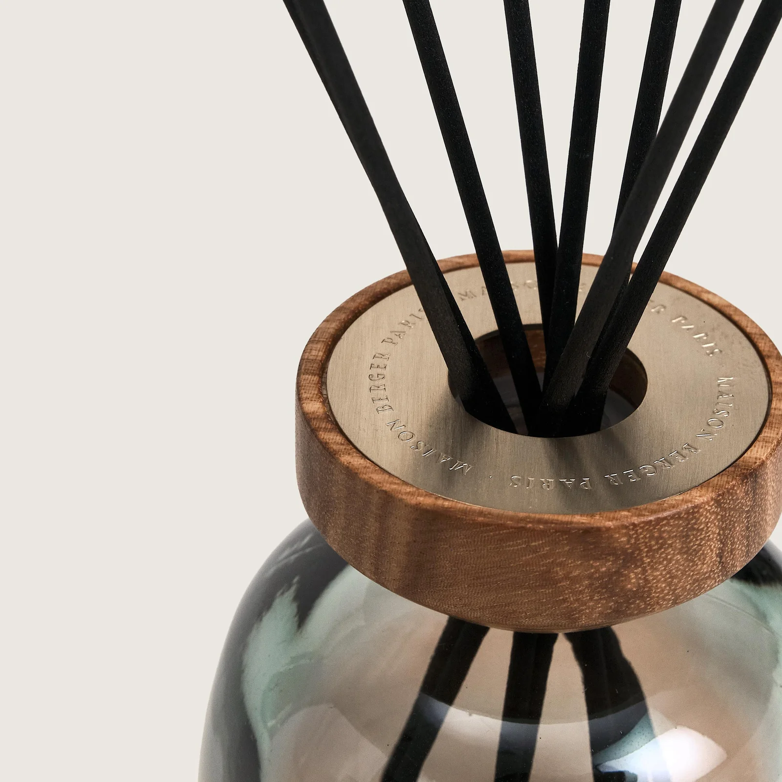 Il bouquet di fragranze Wood Zeste de Verveine si distingue per il flacone in vetro sfumato verde e prugna, impreziosito da un anello in legno e da una placca in metallo color rame, che aggiunge un tocco di naturale raffinatezza alla tua casa. La fragranza Zeste de Verveine si ispira alla vibrante freschezza degli agrumi e al vivace profumo della verbena. Le note di testa di lime, cedro e pepe rosa offrono un'apertura frizzante e luminosa. Il cuore, composto da verbena, lavanda e menta, evoca la verdeggiante freschezza di un giardino aromatico. Le note di fondo di ambra grigia e muschio bianco avvolgono la composizione in una morbidezza sottile ed elegante, per una scia delicata e raffinata.