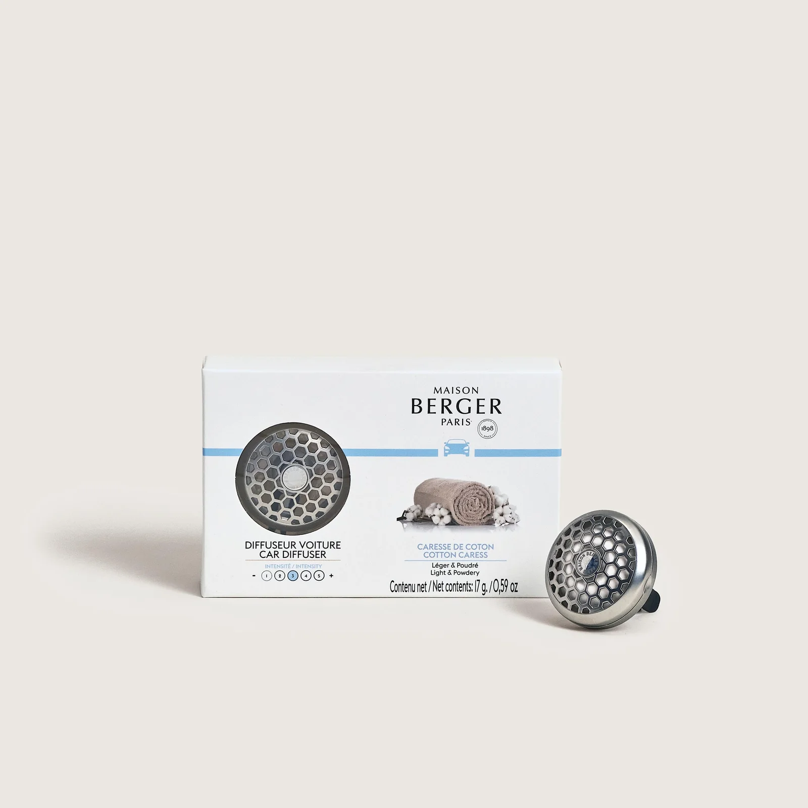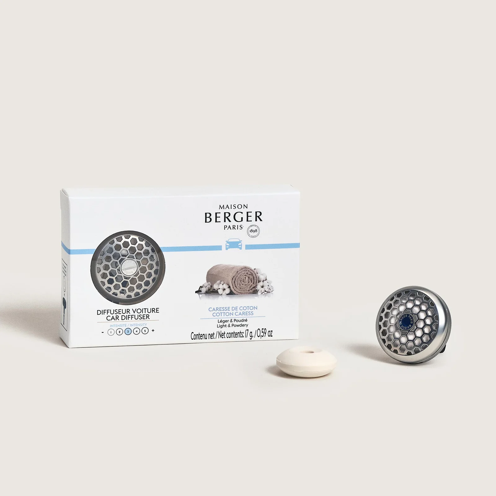 Scopri il piacere di un diffusore per auto argento opaco, abbinato alla fragranza Cotton Caress, per viaggi avvolti da morbidezza e serenità.