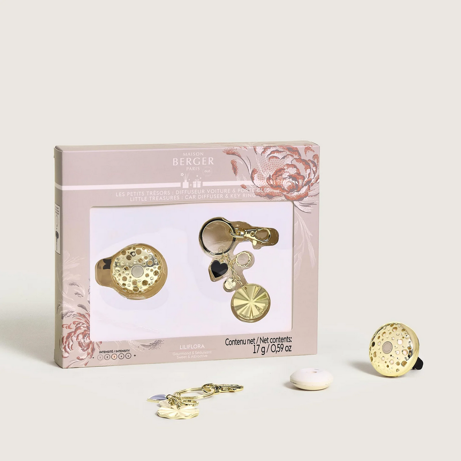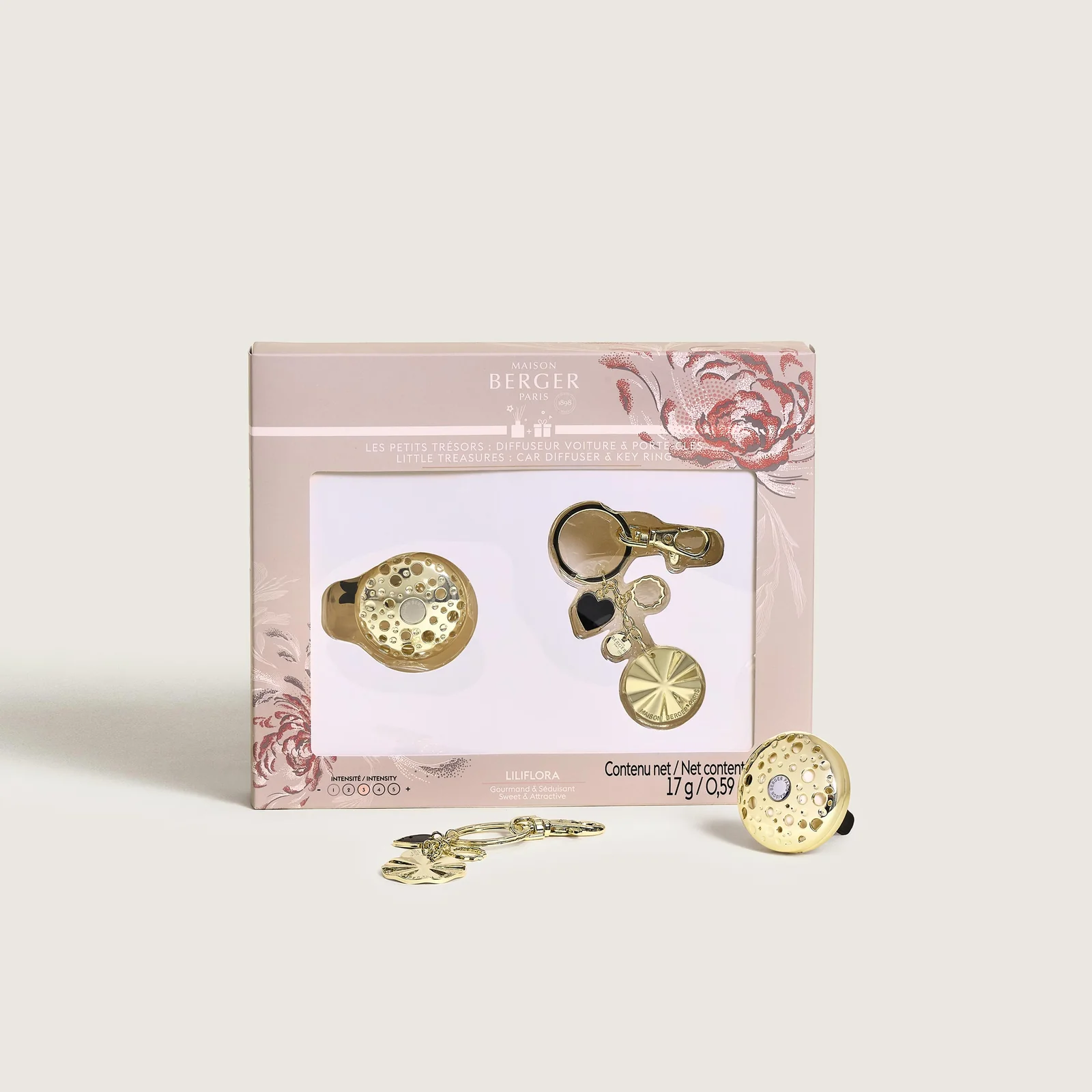 Rendi più piacevoli i tuoi viaggi con il cofanetto regalo Les Petits Trésors Ophelia Or, che include un diffusore per auto, un portachiavi e la delicata fragranza di Liliflora.